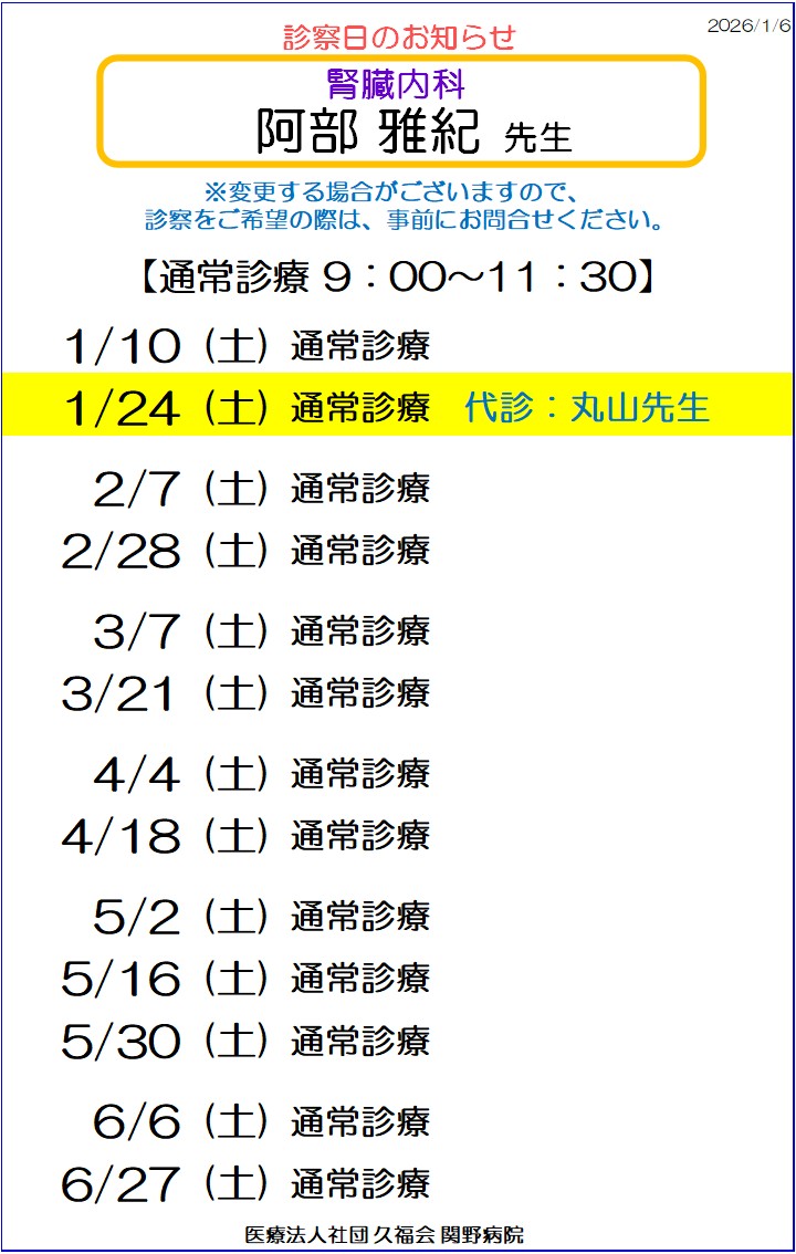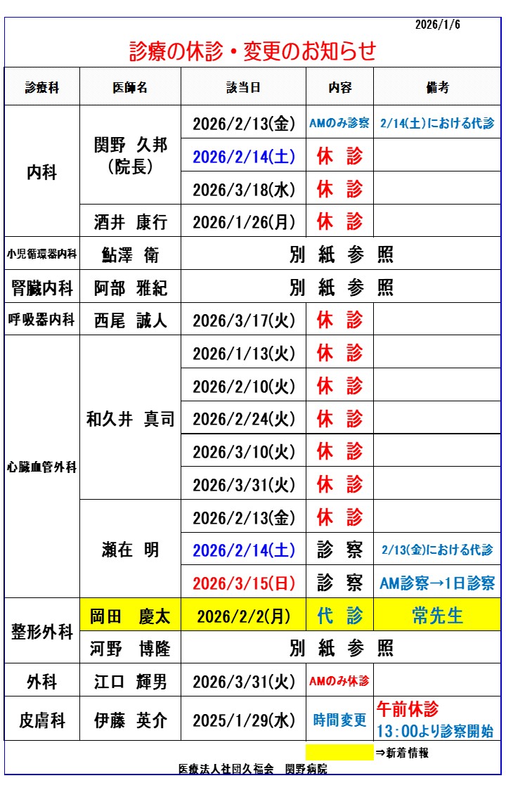 トップ お知らせ一覧 休診情報更新のお知らせ(2026/1/6 16:15現在)